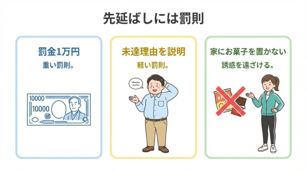 目標が達成できなければ罰金を払う仕組みは強力です。例として「ダイエットのため週3回のジョギングができなかったら、パートナーに1万円を支払う」などのルールを決める方法があります。